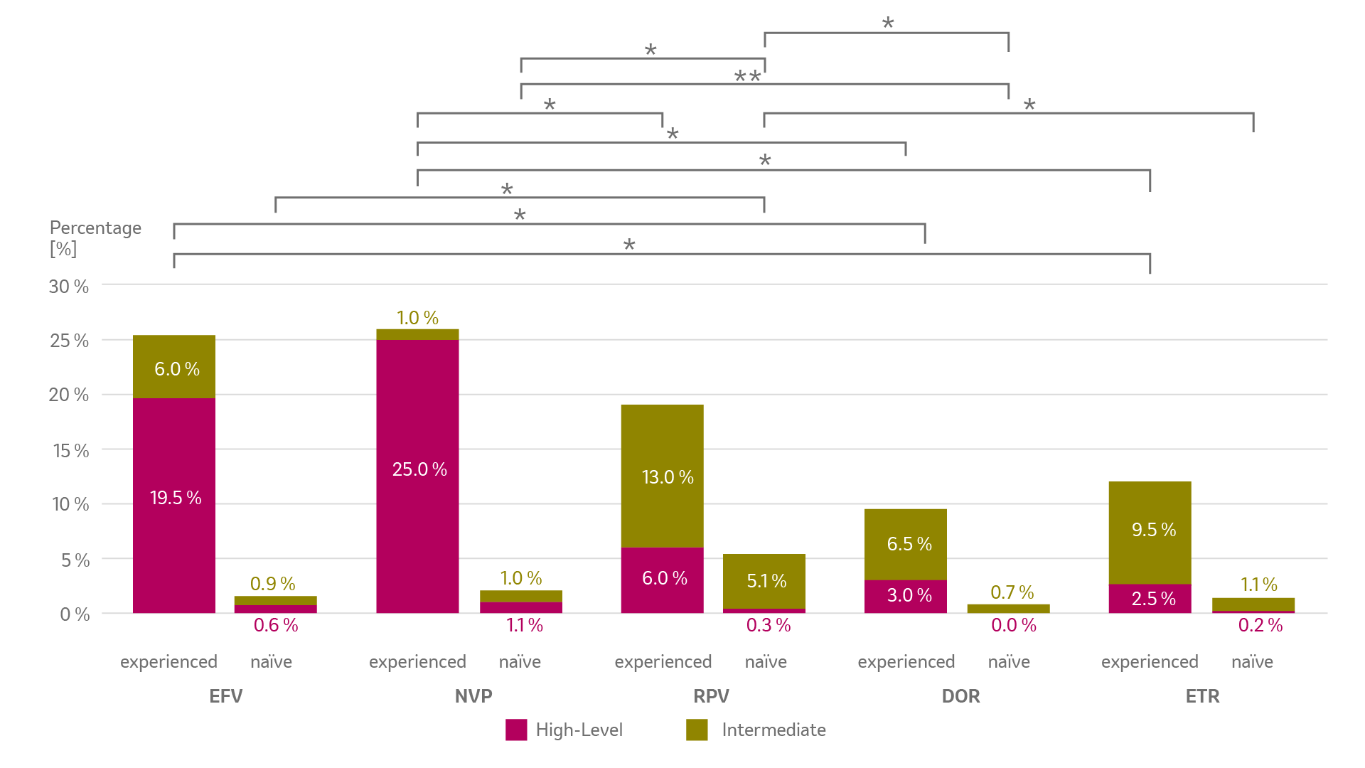 - Chez les patients ayant déjà suivi un traitement, la fréquence de la résistance à la doravirine était de 9,5%. Au sein de ce groupe, des différences significatives ont été observées par rapport à l’éfavirenz (25,5%; p < 0,0001) et à la névirapine (26,0%; p < 0,0001) (voir Figure 1).