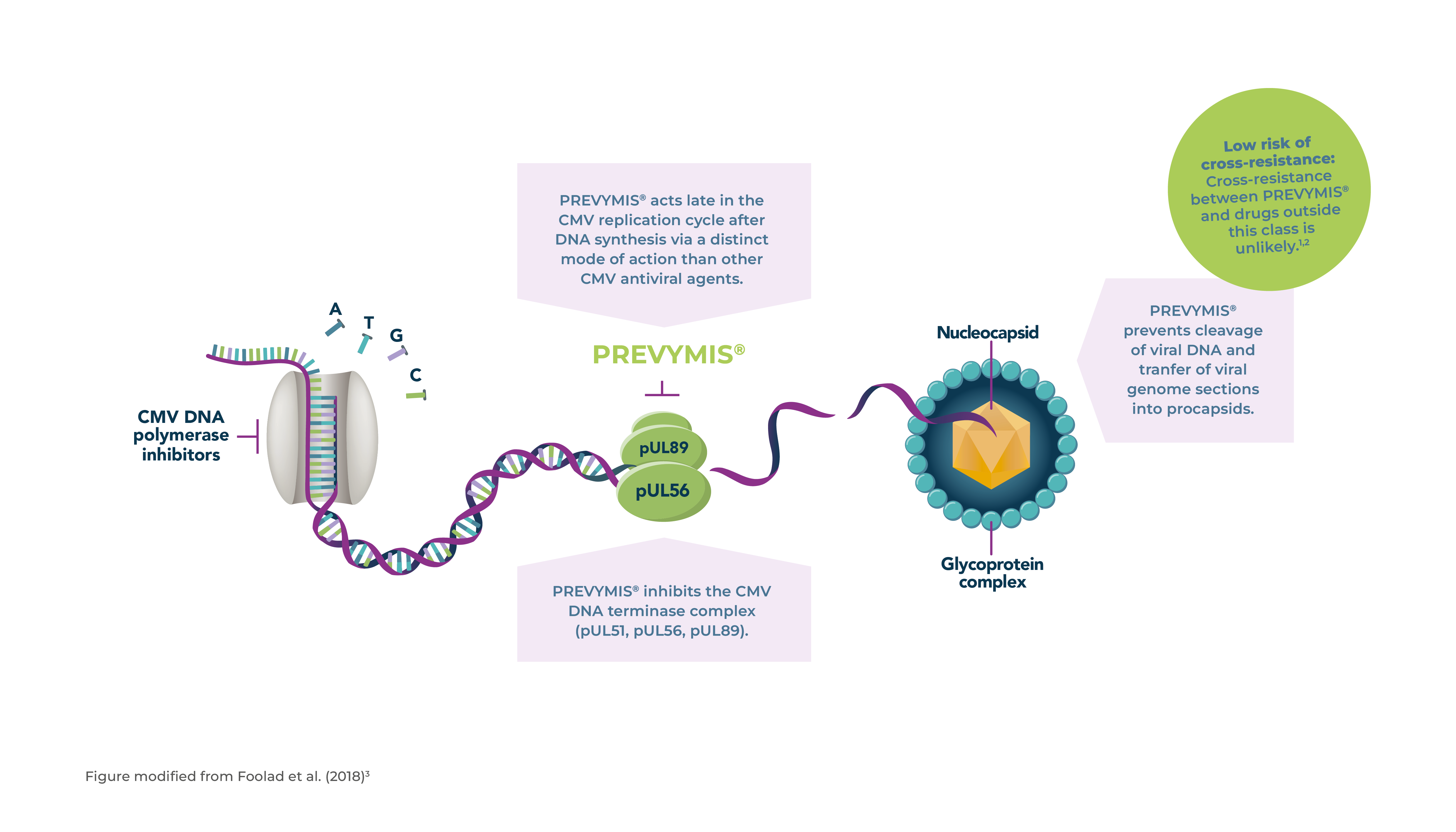 PREVYMIS® présente un mécanisme d’action bien spécifique, qui empêche la réplication du virus CMV par inhibition du complexe terminase.3