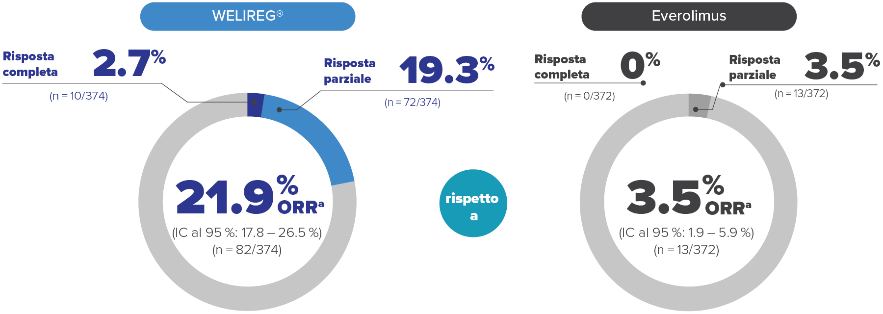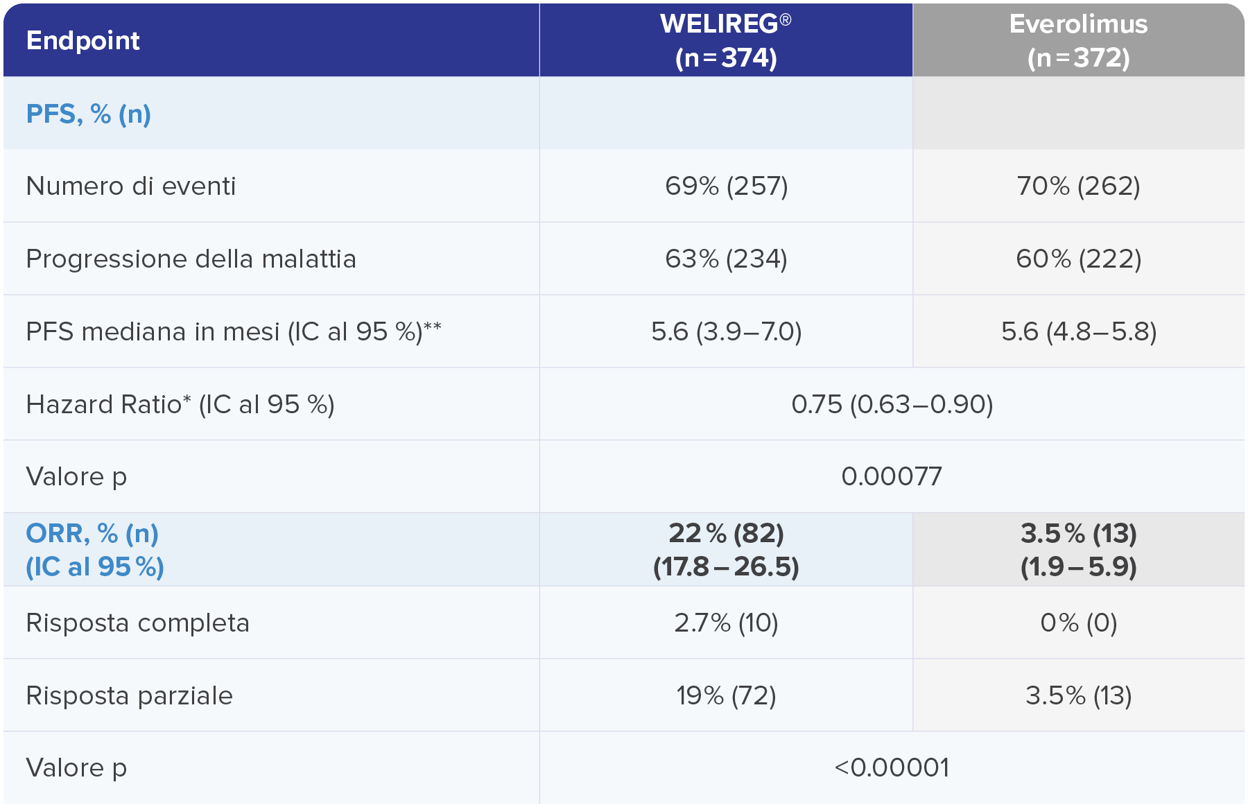 b. Lo 0.5% dei pazienti nel braccio WELIREG® e l’1.1% nel braccio everolimus avevano ricevuto 4 terapie precedenti (violazione del protocollo).