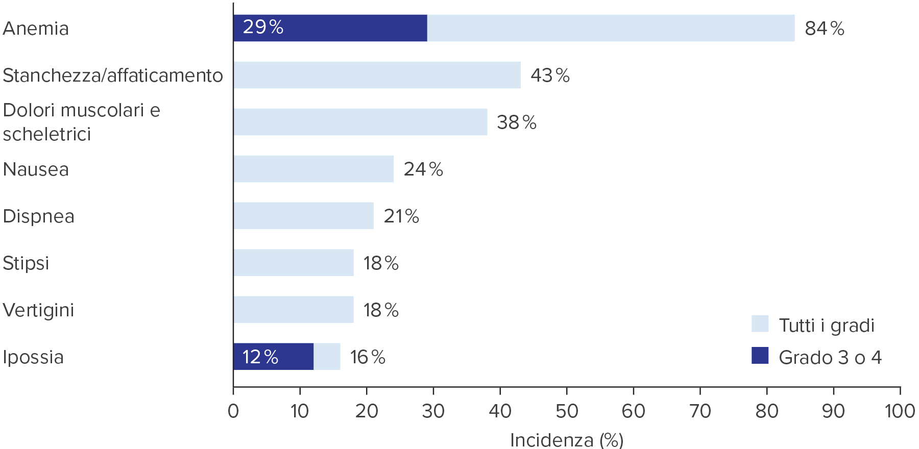 - Nei dati di sicurezza aggregati, l’anemia è stata riportata nell’84% dei pazienti, di cui il 29% presentava un’anemia di grado 3-4. Il tempo mediano alla comparsa di eventi di anemia di tutti i gradi di gravità è stato di 51.7 giorni (intervallo: da 1 giorno a 27.4 mesi). In 41 pazienti (7.1%) sono comparsi eventi di anemia che hanno portato alla sospensione del trattamento in studio, e in 22 pazienti (3.8%) la dose è stata ridotta a causa dell’anemia. In 2 pazienti (0.3%) il trattamento è stato interrotto a causa dell’anemia. Secondo il rapporto, 165 pazienti (34%) si erano ripresi dall’anemia e 249 pazienti (51%) non si erano ancora ripresi.